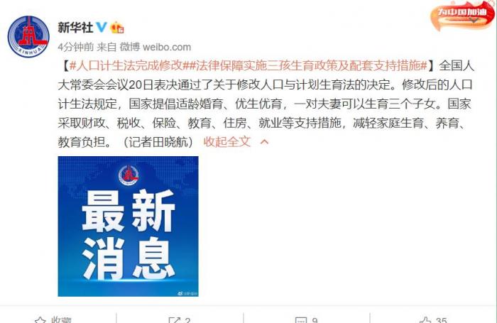 全国人大常委会会议20日表决通过了关于修改人口与计划生育法的决定。修改后的人口计生法规定,国家提倡适龄婚育、优生优育,一对夫妻可以生育三个子女。国家采取财政、税收、保险、教育、住房、就业等支持措施,减轻家庭生育、养育、教育负担。