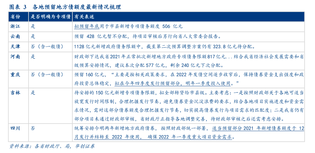 “会预留”指我们预计部分新增专项债额度会预留四季度、尤其是12月发行,预留资金大部分将结转至2022年年初形成投资额,以响应7月政治局会议“推动今年底明年初形成实物工作量”的号召:一是8月9日,21世纪经济报道提及“按照监管要求,地方将预留部分专项债额度在今年12月发行,这部分资金需在明年年初支出形成实物工作量”;二是多省已明确预留地方债额度年底发(绝大部分为专项债),明年一季度投入使用,包括浙江(506亿元)、云南(428亿元)、天津(324亿元,含一般债)、河南(240亿元)、重庆(160亿元,含一般债)、吉林(150亿元)、四川(未明确具体额度,但明确适当预留部分新增额度12月发行并结转至2022年使用)等,预留比重平均23%。