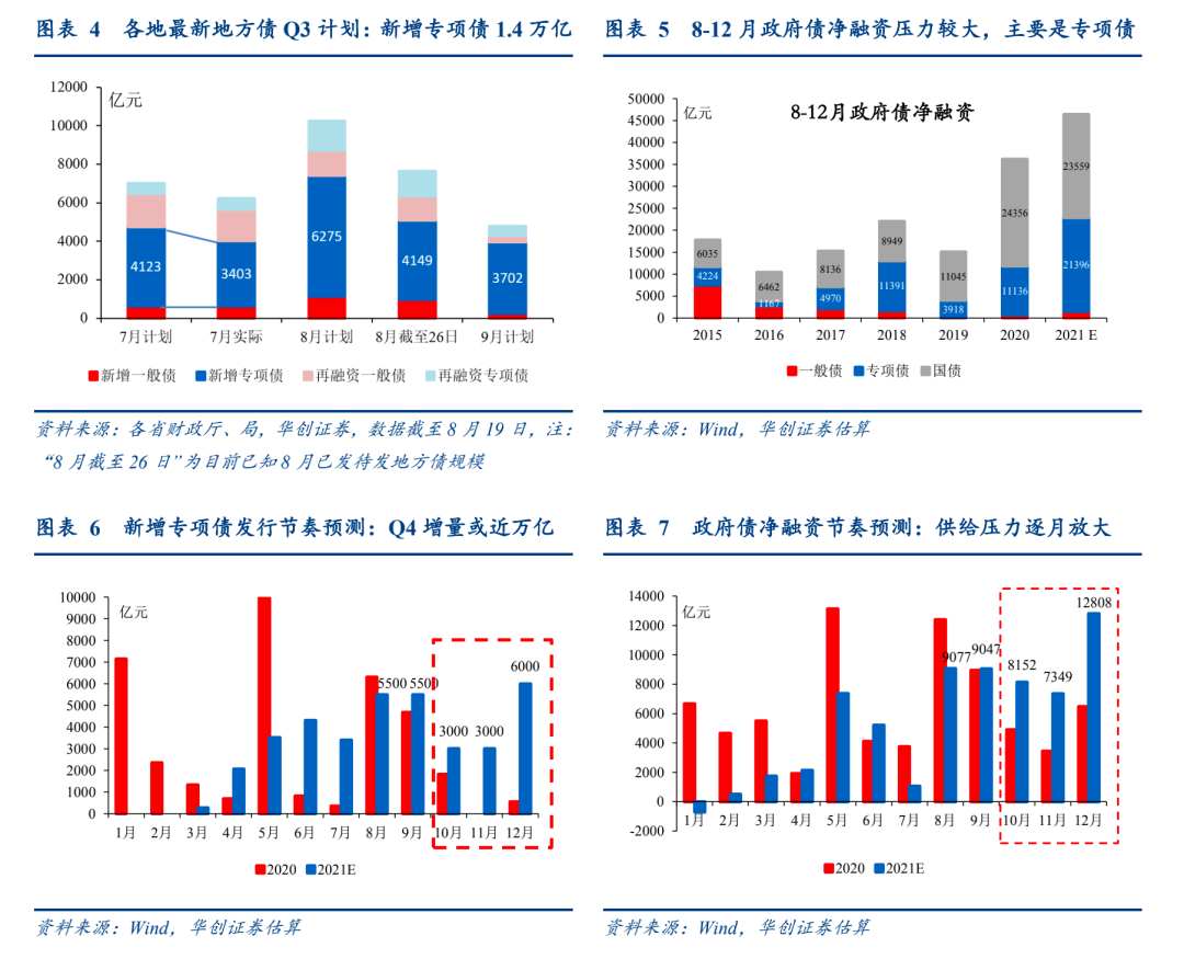 总的来看,出于预算的严肃性,我们认为今年3.65万亿新增专项债大部分仍将于年内发行完毕,参考财政部“适度均衡/合理把握发债节奏”的要求、各省Q3地方债发行计划(目前合计约1.4万亿,有待各地9月发行计划进一步披露)、Q4明确预留额度(尤其是12月)的安排,我们预计8-12月新增专项债分别发行5500、5500、3000、3000、6000亿元,Q4相比2020年同期增量或近万亿。一般债和国债净融资参考2017-2019年同期节奏,对应8-12月政府债净融资规模分别为:0.9、0.9、0.81、0.73、1.28万亿元。相比2020年同期,供给压力逐月放大。