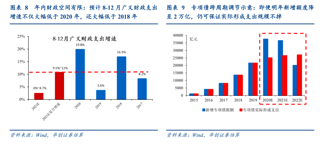 再看财政空间,专项债发在今年钱用在明年,意味着年内财政实际投资后倾力度趋弱,而明年财政前倾窗口打开。根据我们的新增专项债发行节奏预测,大概率有约万亿专项债结转到2022年一季度形成支出,意味着年内剩余广义财政空间需要扣减1万亿。对应的,我们预计今年8-12月广义财政支出同比增速由5.6%~10.4%降至0%~4.7%,复合增速由12.5%~15%降至9.5%~12%,不仅大幅低于2020年同期的19.8%,还大幅低于2018年的同期16.9%,重申不应高估今年下半年财政后倾发力程度(但后续边际加速值得跟踪)。而对于明年,实际财政空间将比预算空间更大,体现财政跨周期调节:如即便明年新增专项债额度降至2万亿,若加上今年年底结转明年使用额度(假设约1万亿),仍可保证约3万亿的新增专项债可在明年形成支出,相对2020年、2021年专项债实际形成支出规模实际上是不掉的(若用的较满,甚至可能略有增量)。且在发改委较往年提前两个月要求储备2022年专项债项目、以备年初开工的背景下,明年财政发力前倾的特征将相对明显。