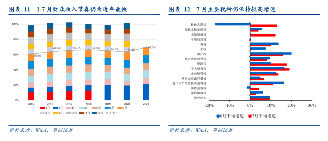 分税收和非税收入看,税收收入单月增速稳住9.3%(6月为9.3%),主要拉动仍来自PPI反弹背景下的企业所得税、增值税,资源税亦表现不俗。主要税种方面,7月企业所得税两年平均增长13.4%,较6月的12.2%进一步上升,拉动税收收入两年平均增速4.4个百分点,主要是PPI高位反弹,企业利润持续稳定增长;个人所得税持续高增,两年平均增长18.9%,6月为16.4%,拉动税收收入两年平均增速0.9个百分点,主要受居民收入随经济恢复增长带动;增值税增速略有下滑,两年平均增长2.6%,6月为6.1%,仍拉动税收收入两年平均增速0.9个百分点,主要反映工业服务业稳步增长以及PPI上涨。此外,资源税增速大幅上行,两年平均增长17.5%,6月为9.7%,凭借在税收收入中仅约1%占比拉动其两年平均增速0.2个百分点,体现其作为大宗贡献税收对PPI高敏感——我们测算大宗涨价2021年可为财政带来约5500~9500亿的税收增量,相当于全年财政收入的2.8%~4.8%,可拉动全年财政收入同比增速3~5.2个百分点(详情参考专题报告《大宗涨价是地方财政的“急救包”吗?》)。