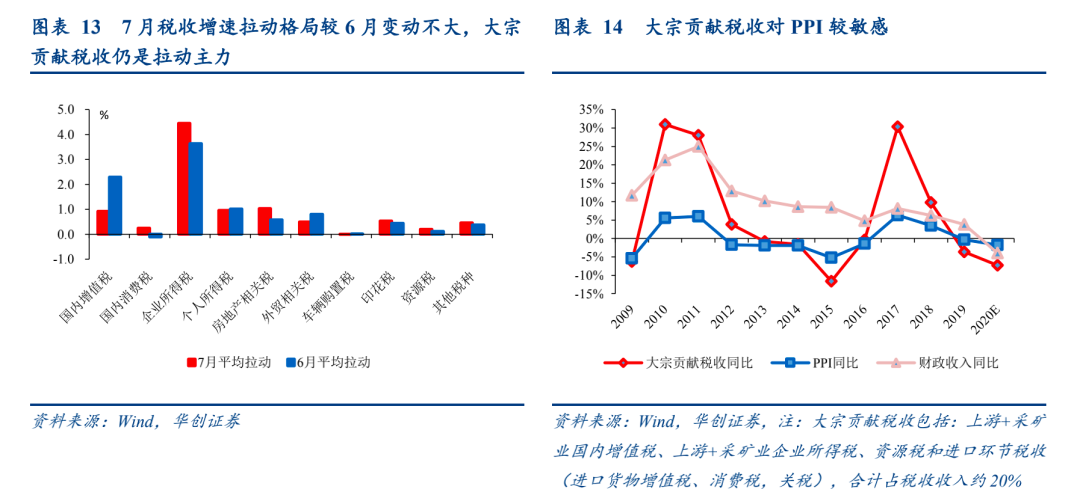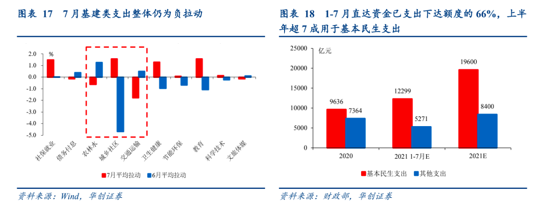分支出类型看,基建类支出表现分化,整体仍为负拉动,主要拖累来自中央主导的交通运输支出;民生支出重拾升势,1-7月直达资金已形成支出1.757万亿元,上半年超7成用于基本民生。城乡社区、交通运输、农林水三项基建类7月两年平均增速分别为39.9%、-26.7%,-5%,6月分别为-28.1%、15.5%、17.5%,基建类支出整体仍拖累财政支出0.8个百分点(6月为拖累2.9个百分点),由于今年基建类支出全年预算安排零增长,后续弹性不可高估;7月民生支出重拾升势,社保就业、卫生健康、教育支出两年平均增速分别为13.5%、23.1%、11.8%,6月分别为0.2%、-10.3%、-7%,合计拉动财政支出两年平均增速4.4个百分点。据财政部介绍,今年2.8万亿直达资金中,1-7月已形成支出1.757万亿元(占中央财政已下达的66.1%),重点用于支持全面落实“六保”任务、做好基层“三保”工作等方面;上半年直达资金有7成以上用于基本民生,高于去年的57%,反映今年财政在“休养生息”的预算基调下,仍腾挪资源将“保民生”作为基石。