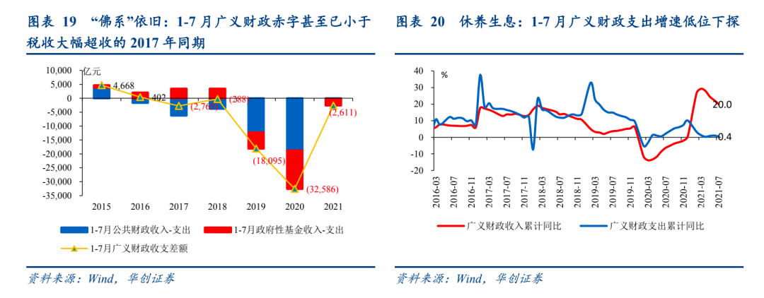 收入端,7月税收收入受益于PPI高位反弹而企稳,主要税种仍保持较高增速,企业所得税、增值税仍是拉动主力;后续同比增速或在基数抬高、PPI回落、经济下行三重压力下快速下行;支出端,仍未发力,支出进度较2018年同期差距仍在拉大,“赶进度”尚未出现。基建类支出负拉动加深,主要拖累项来自中央主导的交通运输支出,上半年整体低增+偏向民生+基建拖累的格局仍在延续;广义财政依旧“佛系”,1-7月广义财政赤字甚至已小于税收收入大幅超收的2017年同期,广义财政支出增速低位再下探(仅0.4%),创去年年初疫情以来次低。收支累计增速差虽继续收窄,但动力主要来自土地出让金收入快下带来的政府性基金收入增速回落,而非市场预期的公共财政支出“赶进度”以及专项债发行加速带来的政府性基金支出发力。