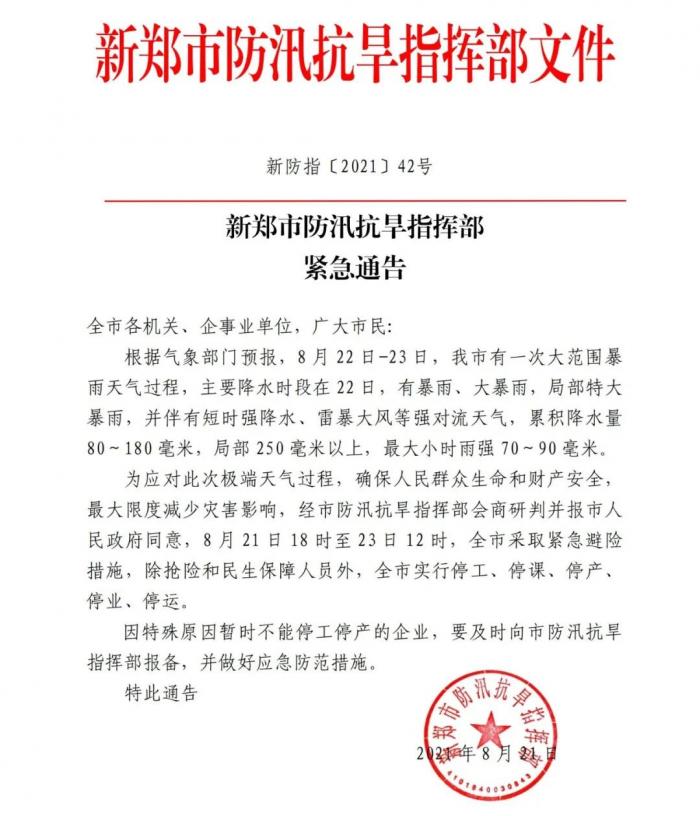 为应对此次极端天气过程,确保人民群众生命和财产安全,最大限度减少灾害影响,经市防汛抗旱指挥部会商研判并报市人民政府同意,8月21日18时至23日12时,全市采取紧急避险措施,除抢险和民生保障人员外,全市实行停工、停课、停产、停业、停运。