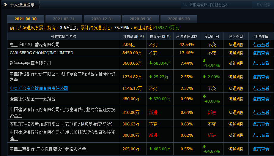 图4 2021年中报披露重庆啤酒前十大流通股东