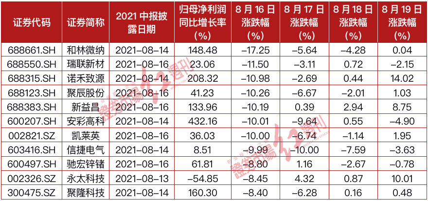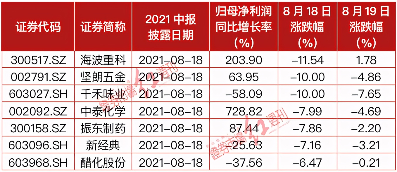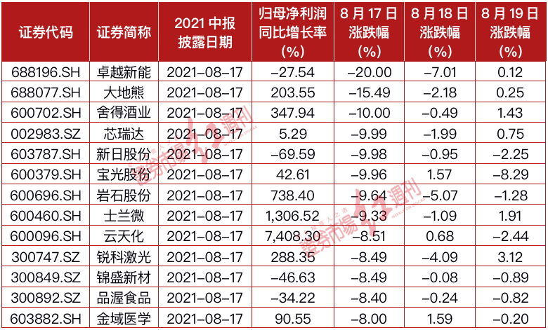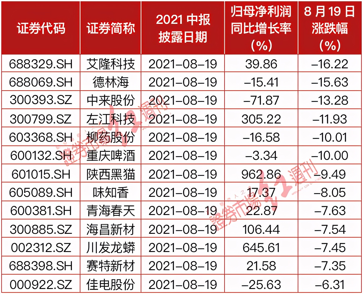8月19日当天,共有74家公司公布2021年中报,超过4家公司在财报日当天股价跌幅超过10%,其中,柳药股份、重庆啤酒跌停。而本周以来,包括安彩高科、凯莱英、信捷电气、卓越新能、芯瑞达、新日股份等在内的多只个股在财报日遭遇跌停。类似凯莱英、重庆啤酒、千禾味业等“白马股”的大跌格外引人注目。