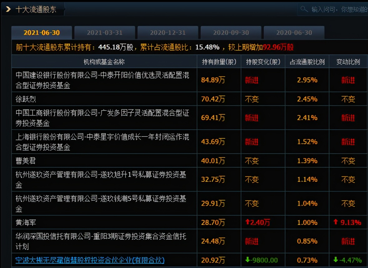 值得注意是,公司中报显示,2021年中期,机构大力加码该公司,如田瑀管理的中泰开阳价值优选混合、中泰星宇一年封闭混合,以及广发多因子混合等多只公募基金新进公司前10大流通股东。