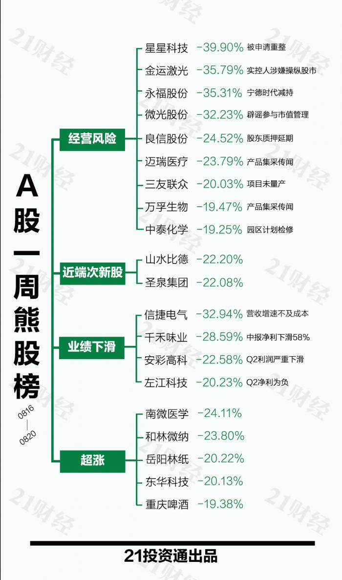 本期最熊股则是天降大雷的星星科技(300256.SZ),周跌幅近40%,5日主力流出逾2.1亿元。