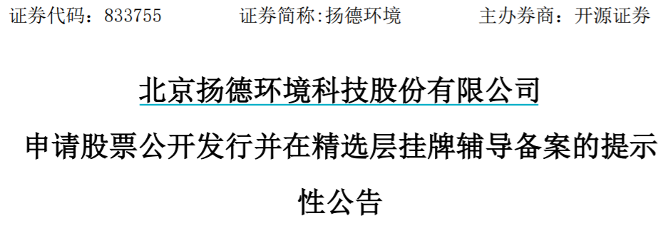 公告显示,扬德环境于 2021年8月20日向北京证监局提交了向不特定合格投资者公开发行股票并在精选层挂牌的辅导备案材料,辅导机构为开源证券。公司已与开源证券签署了《辅导协议》。