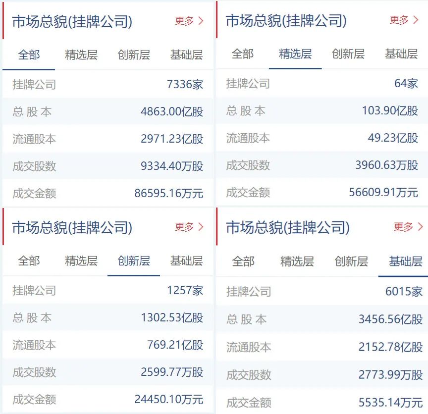 截至8月23日收盘,今日成交金额为8.66亿元,精选层成交金额为5.66亿元,创新层成交金额为2.45亿元,基础层成交金额为0.55亿元;今日成交股数为9334.40万股,精选层成交股数为3960.63万股,创新层成交股数为2599.77万股,基础层成交股数为2773.99万股。