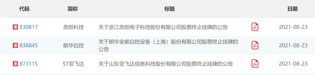 8月23日,新三板基础层公司鼎炬科技(830817)、朗华自控(836845)、亚飞达(873115)终止挂牌。