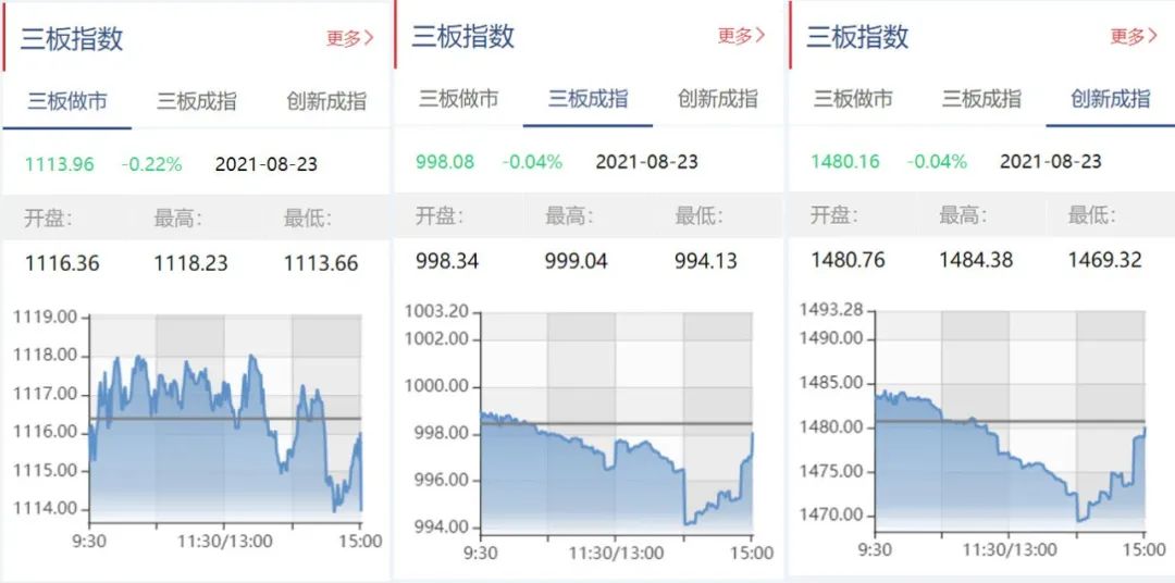 截至8月23日收盘,三板做市报1113.96点,下跌0.22%;三板成指报998.08点,下跌0.04%;三板创新报1480.16点,下跌0.04%。