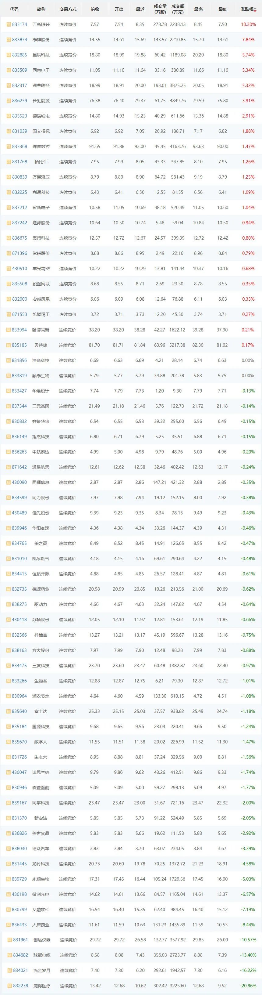 8月23日,精选层普跌,22家企业上涨,2家平盘,40家下跌。其中,五新隧装(835174)上涨10.30%,涨幅居首;其次,泰祥股份(833874)上涨7.84%;鹿得医疗(832278)跌幅居首,下跌20.86%;流金岁月(834021)居次下跌16.22%;浩淼科技(834856)、颖泰生物(833819)平盘。