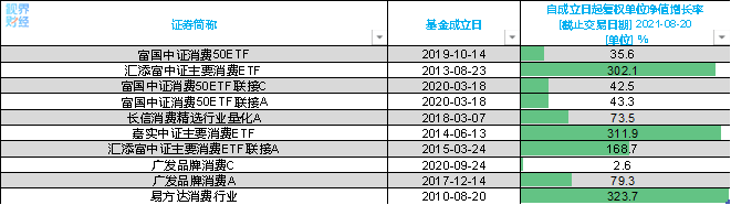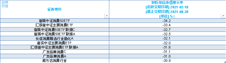 这10只基金包括富国中证消费50ETF、汇添富中证主要消费ETF、长信消费精选行业量化A、广发品牌消费等,净值损失均超过30%,具体如下: