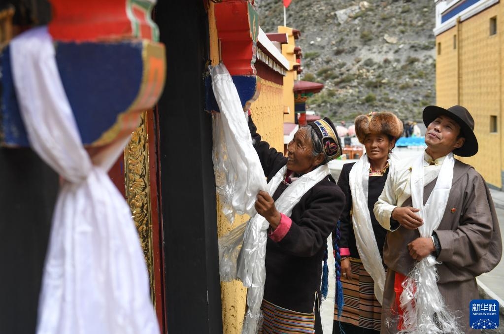 西藏山南市洛扎县洛扎镇居民旦增曲珍(左)给新房献哈达(2019年9月21日摄)。新华社记者晋美多吉摄