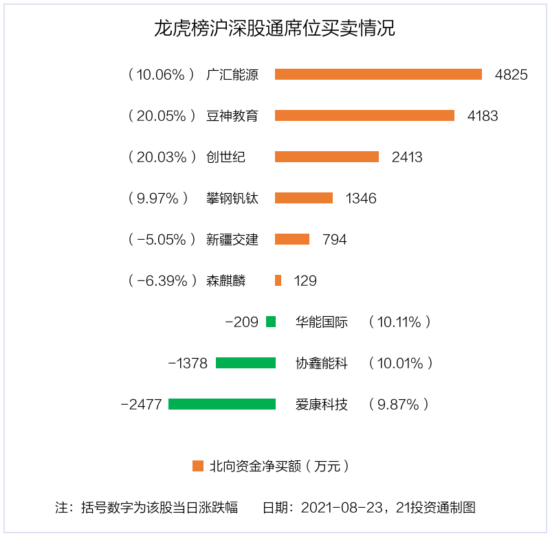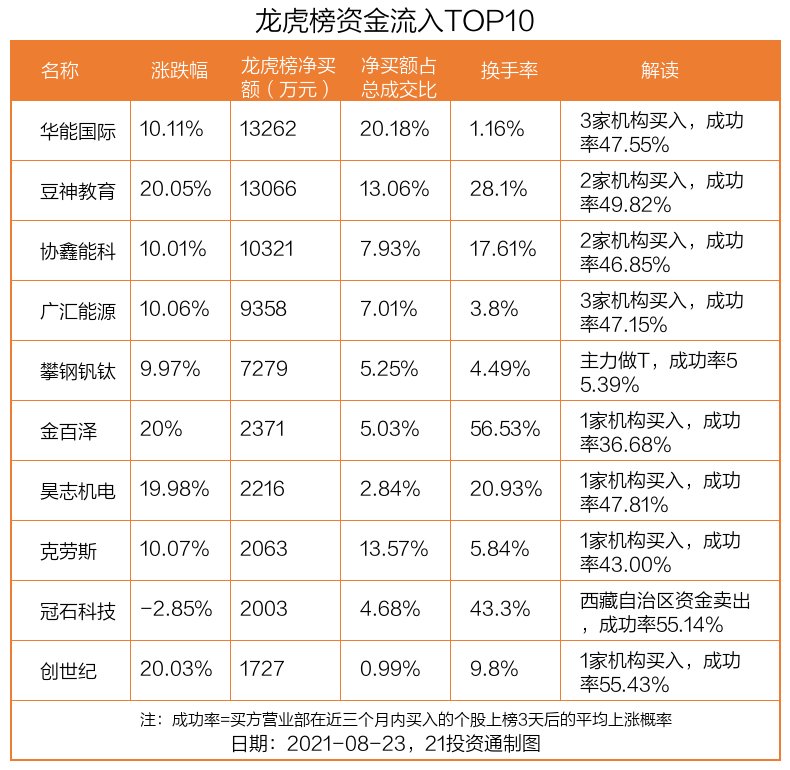 8月23日,上证指数上涨1.45%,深证成指上涨1.98%,创业板指上涨3.16%。盘后龙虎榜数据显示,共有35只个股因当日异动登上龙虎榜,资金净流入最多的是华能国际(600011.SH),达1.33亿元。
