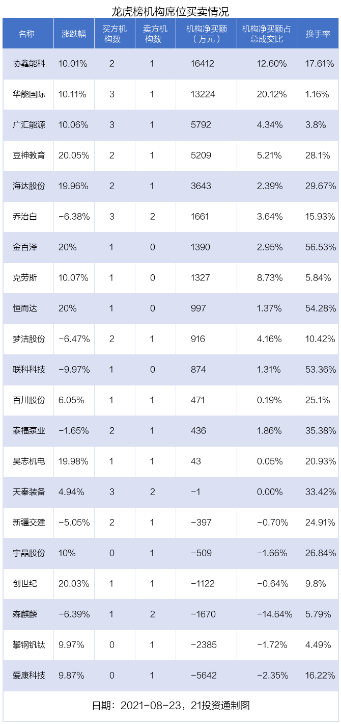8月23日,21只个股龙虎榜出现了机构的身影,机构合计净买入4.07亿元。具体来看,机构净买入14股,净卖出7股。