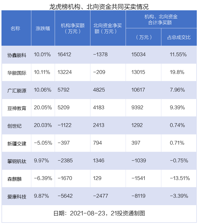 值得注意的是,机构和北向资金共同净买入了广汇能源、豆神教育等2股;共同净卖出了爱康科技;在创世纪、攀钢钒钛、新疆交建、森麒麟、华能国际、协鑫能科上出现分歧。