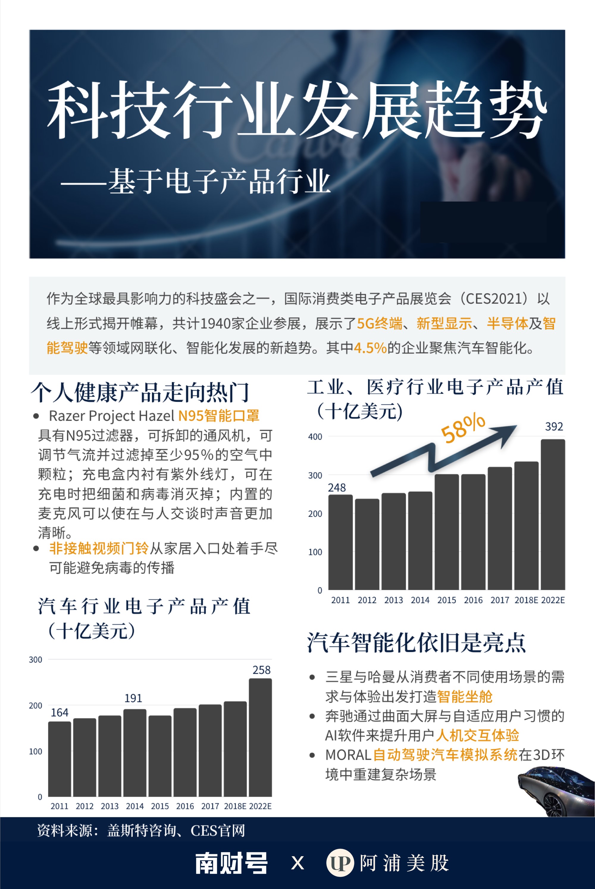 作为全球最具影响力的科技盛会之一,国际消费类电子产品展览会(CES2021)以线上形式揭开帷幕,共计1940家企业参展,展示了5G终端、新型展示、半导体、以及智能驾驶等领域网联化、智能化发展的新趋势。其中4.5%的企业聚焦汽车智能化。