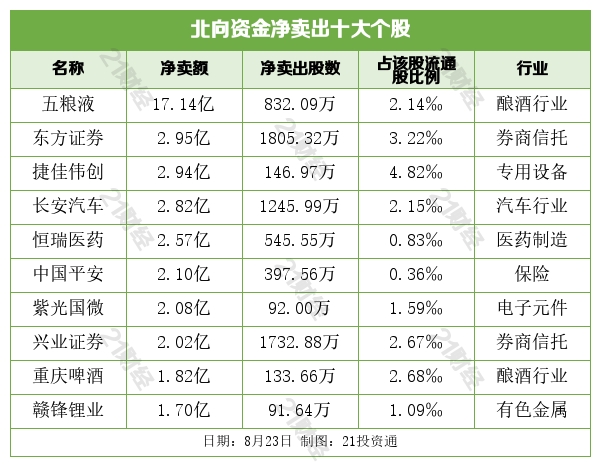 北向资金净卖出五粮液(000858.SZ)、东方证券(600958.SH)、捷佳伟创(300724.SZ)、长安汽车(000625.SZ)、恒瑞医药(600276.SH)居前。