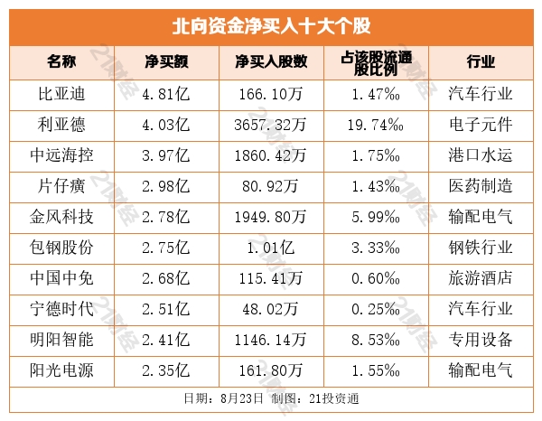 个股方面,北向资金净买入比亚迪(002594.SZ)、利亚德(300296.SZ)、中远海控(601919.SH)、片仔癀(600436.SH)、金风科技(002202.SZ)居前。