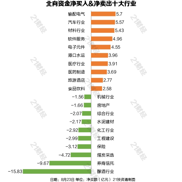 据21投资通(微信号ID:touzit21)智能监测,8月23日,北向资金净买入18.31亿元,其中沪股通净买入4.57亿元,深股通净买入13.74亿元。增持输配电气,减持酿酒行业。