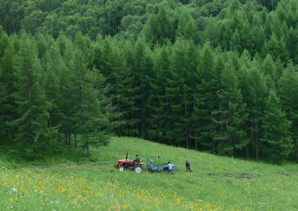 ↑工人在塞罕坝机械林场千层板林场内运输苗木(2013年7月11日摄)。