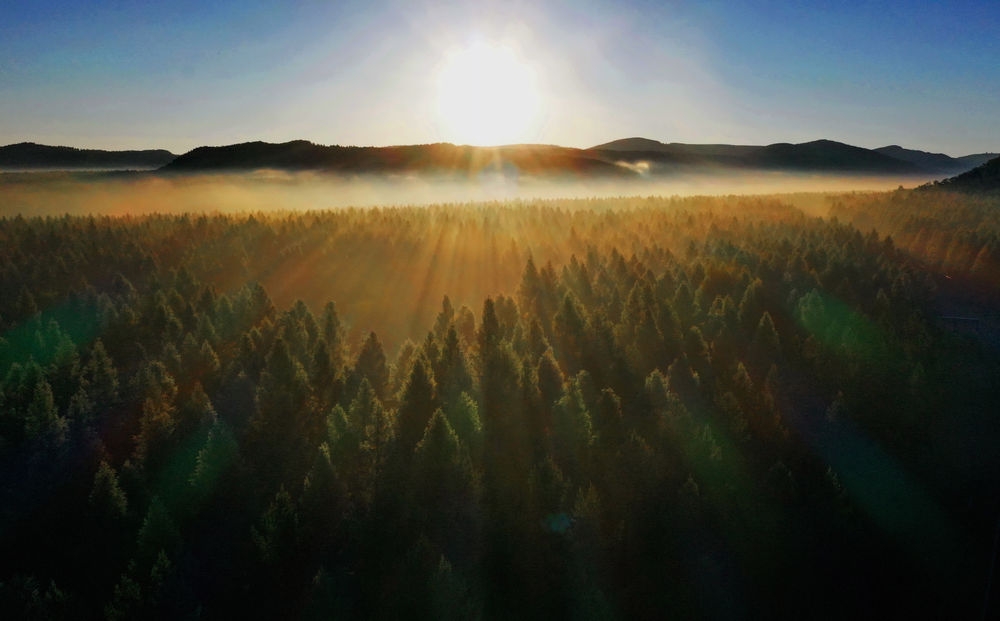 ↑塞罕坝国家森林公园晨景(2021年6月27日摄,无人机照片)。