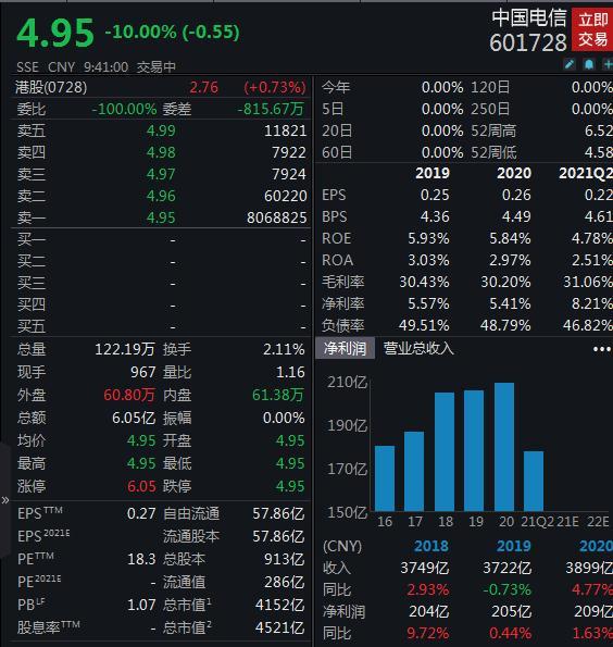 24日,中国电信连续第二日跌停,截至发稿股价报4.95元/股,卖一封单超800万手,总市值4521亿元。两日跌停下,中国电信市值蒸发超900亿元。