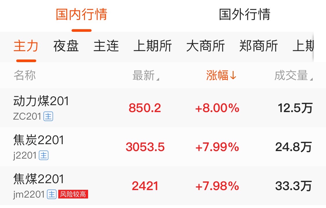 截至8月23日下午收盘,动力煤主力合约大涨8%,报850.2元;焦炭主力合约报3053.5元,涨幅为7.99%;焦煤主力合约涨7.98%,报2421元。