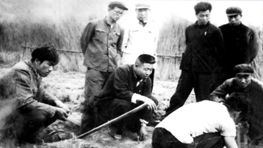 △ 王尚海(左三)和职工一起研究造林技术问题。(资料图)