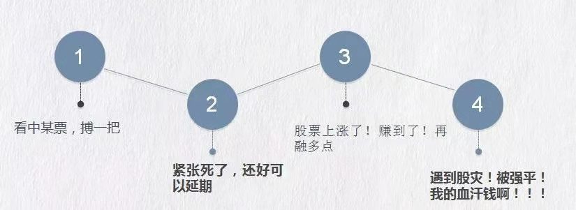 这个图大家一看就懂,它描述了一名股民在融资放杠杆时的心路历程。在股灾短短几个月期间,我亲眼目睹了有客户亏损70%~80%被强平的,也有倒欠证券公司债务的。多年累积的财富平白无故地蒸发了,有些中产家庭失去了翻盘的机会。