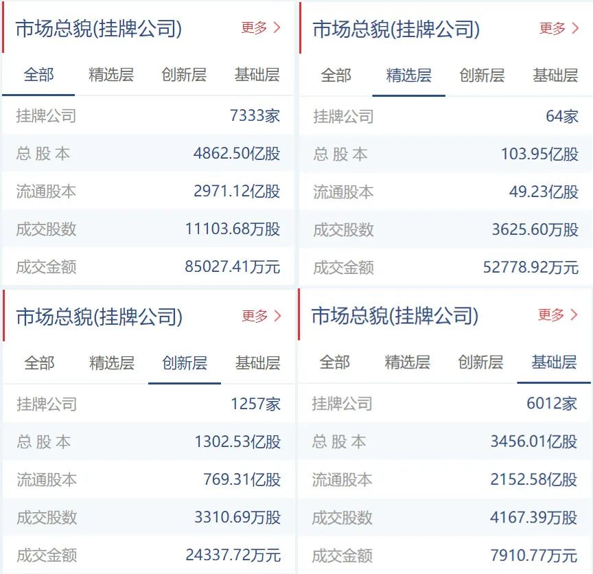 新三板挂牌公司总计7333家(精选层64家,创新层1257家,基础层6012家),总股本4862.50亿股,流通股本2971.12亿股。