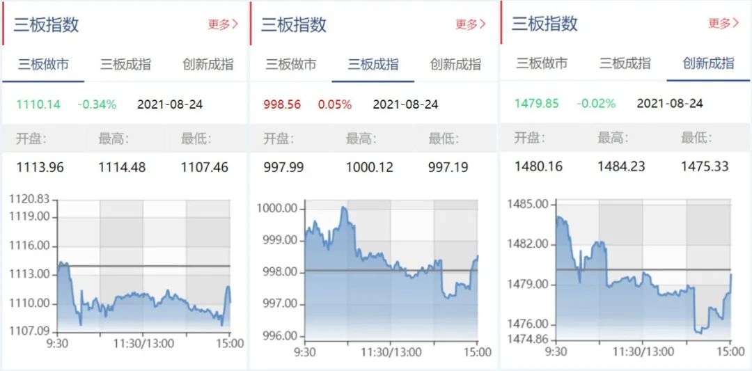 截至8月24日收盘,三板做市报1110.14点,下跌0.34%;三板成指报998.56点,上涨0.05%;三板创新报1479.85点,下跌0.02%。