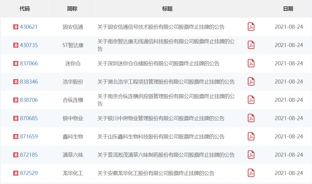 8月24日,新三板基础层公司固安信通(430621)、智达康(430735)、迷你仓(837066)、浩华股份(838346)、合纵连横(838706)、银中物业(870685)、鑫科生物(871659)、滇草六味(872185)、龙华化工(872529)终止挂牌。
