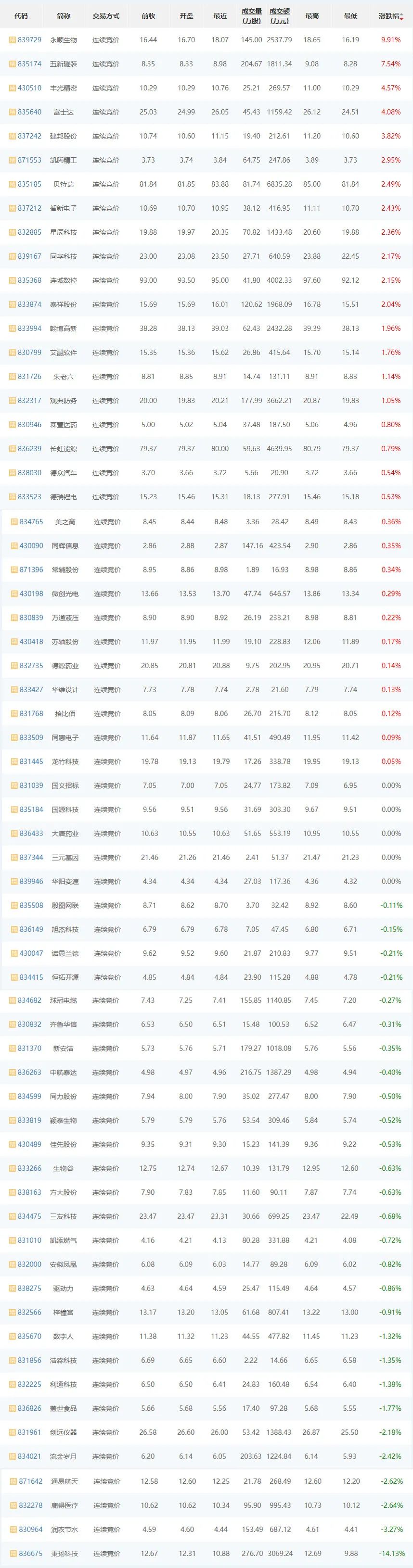 8月24日,精选层涨跌互现,31家企业上涨,5家平盘,28家下跌。其中,永顺生物(839729)上涨9.91%,涨幅居首;其次,五新隧装(835174)上涨7.54%;秉杨科技(836675)跌幅居首,下跌14.13%;润农节水(830964)居次下跌3.27%;国义招标(831019)、国源科技(835184)等平盘。