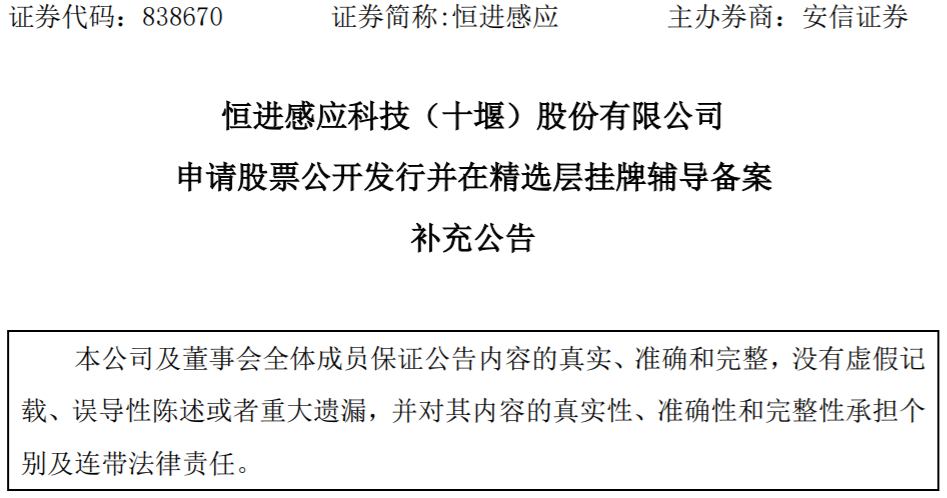 8月24日,恒进感应(838670)发布精选层挂牌辅导备案补充公告。