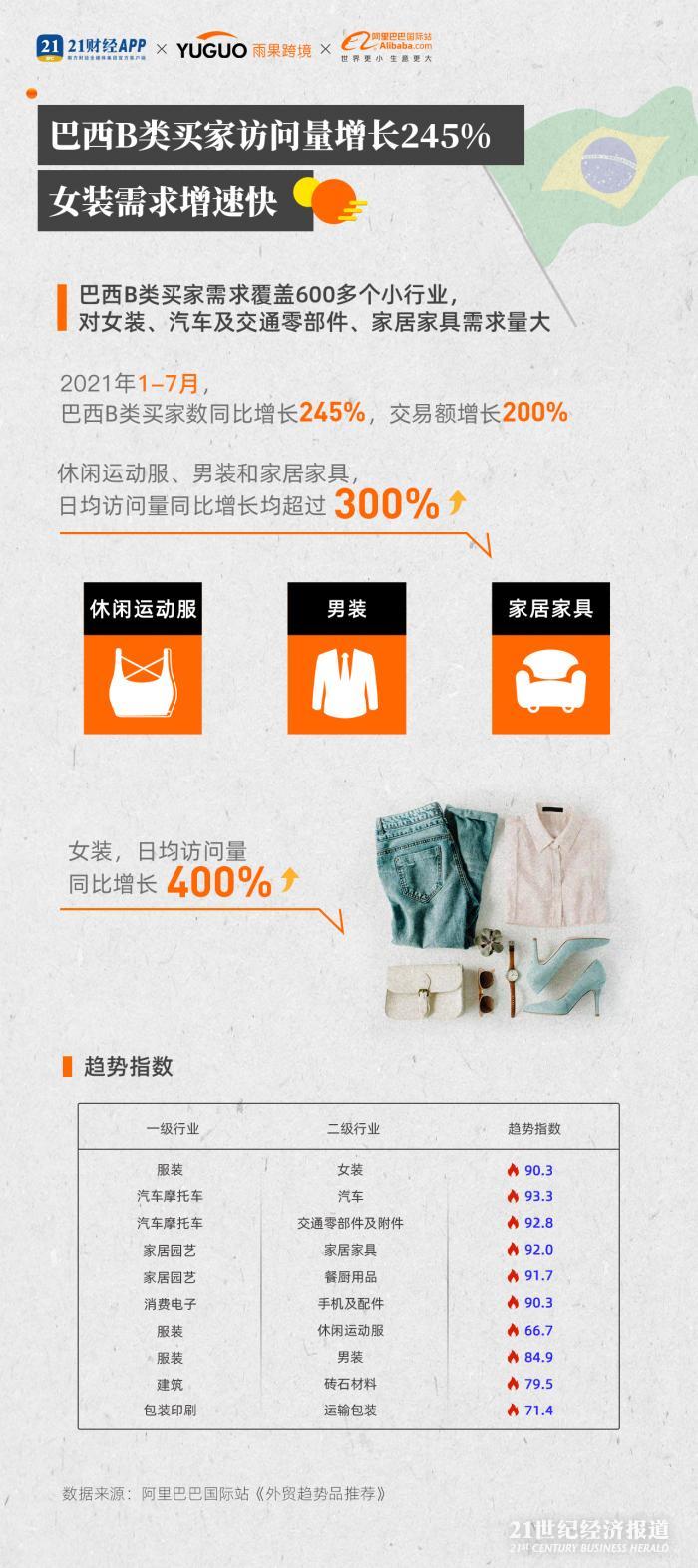 巴西B类买家的需求则覆盖了600多个小行业,其对女装、汽车及交通零部件、家居家具需求量最大。2021年1-7月,巴西B类买家数同比增长245%,交易额增长200%。其中,休闲运动服、男装和家居家具的日均访问量同比增长均超过300%,女装的日均访问量同比增长400%。