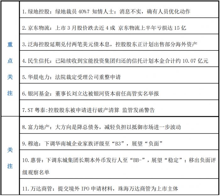 21世纪资管研究院研究员赵阳 实习生刘畅 近日,随着中报披露季来临,各家上市公司的上半年成绩单正在密集发布中,投资人也在实时监控着各公司的动态。京东物流上市3月股价跌去近4成,京东物流上半年亏损达15亿。此外热点地产主体方面,针对绿地裁员40%的传闻,接近绿地控股知情人士透露,绿地应对目前行业大环境采取了积极手段,的确有做出优化人员的动作,但不会是如此大的比例。泛海控股延期兑付两笔美元债本息,控股股东正计划出售部分海外资产,为公司提供资金支持。