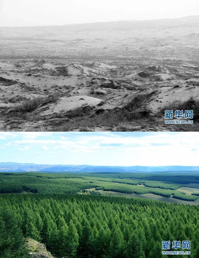 上图为塞罕坝建场前的荒原;下图为如今的塞罕坝。