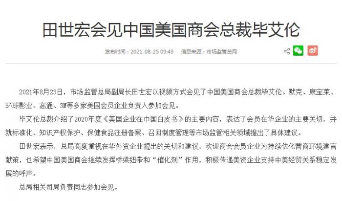 国家市场监督管理总局官网消息,8月23日,市场监管总局副局长田世宏以视频方式会见了中国美国商会总裁毕艾伦。默克、康宝莱、环球影业、高通、3M等多家美国会员企业负责人参加会见。