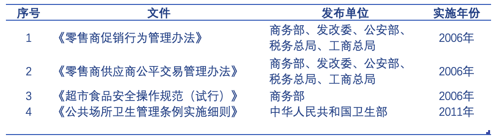 零售行业主要受到《中华人民共和国产品质量法》、《中华人民共和国食品安全法》、《中华人民共和国商标法》、《中华人民共和国消费者权益保护法》等法律管理外,还主要受到以下相关法规的管理: