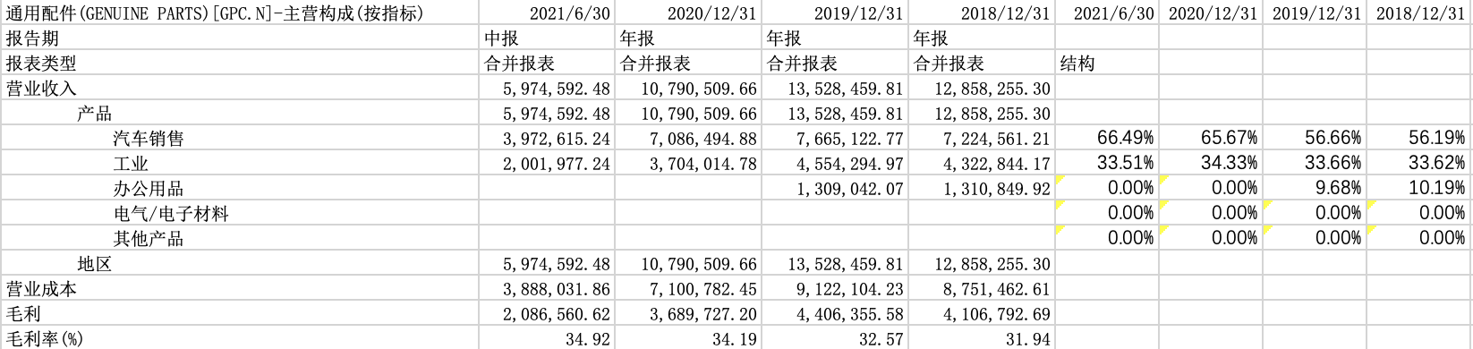 表 以通用配件(GENUINE PARTS)为例为主分析主营结构