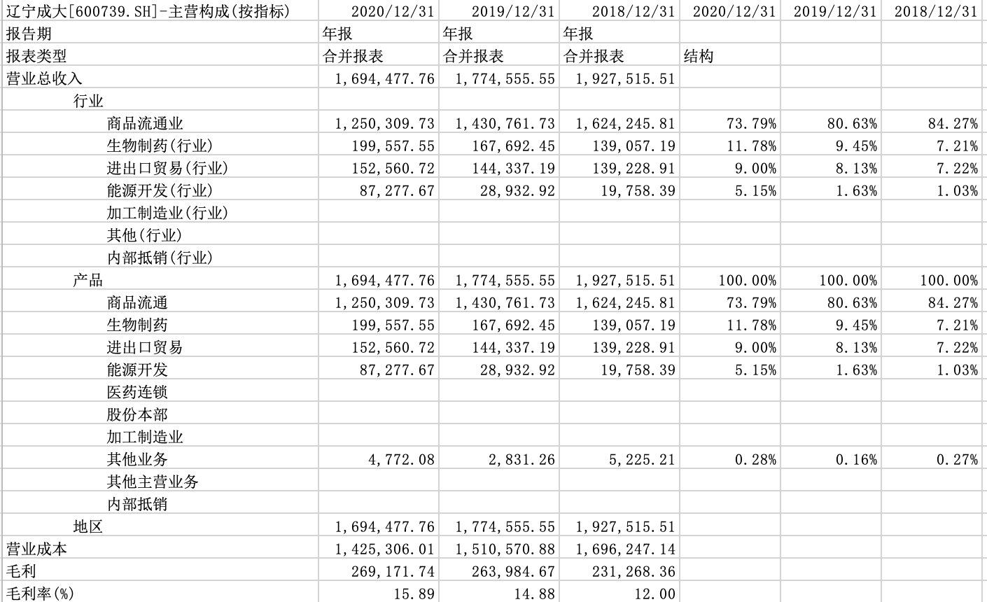 表 辽宁成大主营收入结构