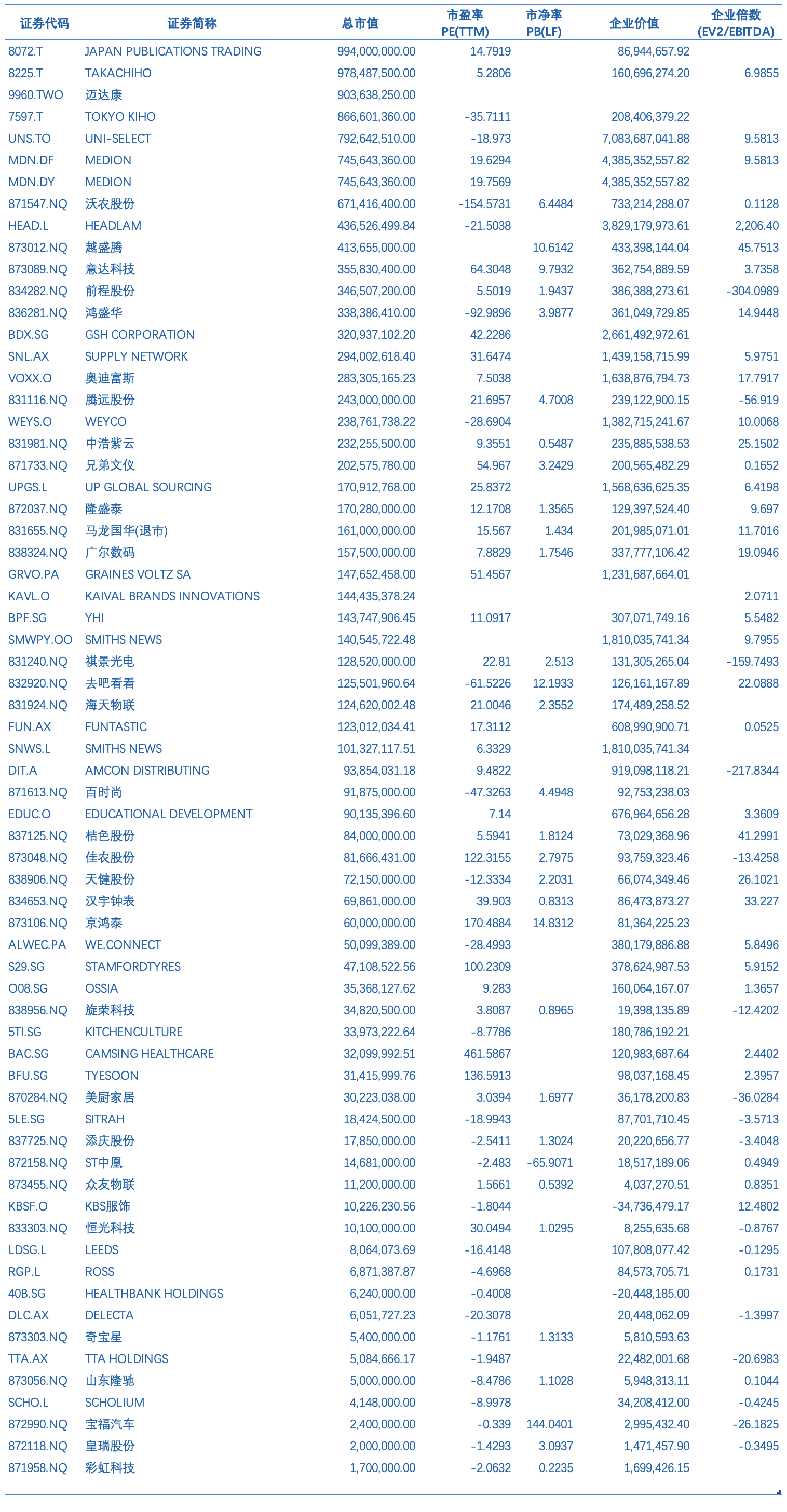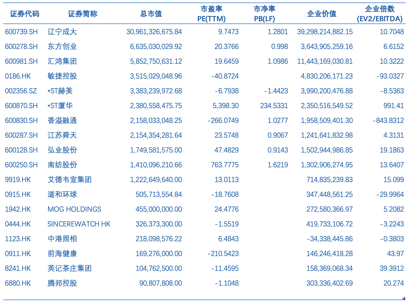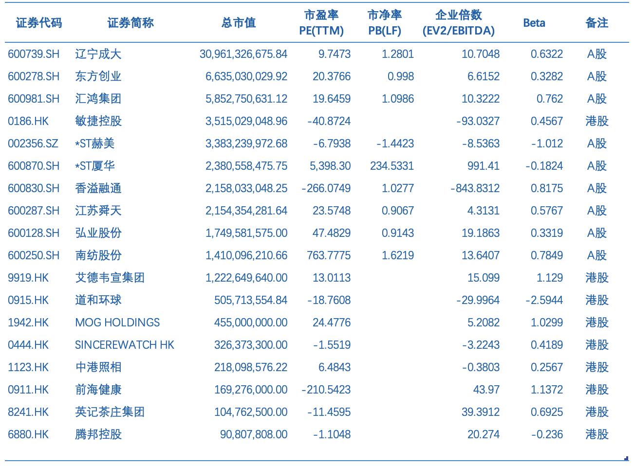 表 中国上市企业公司估值对比