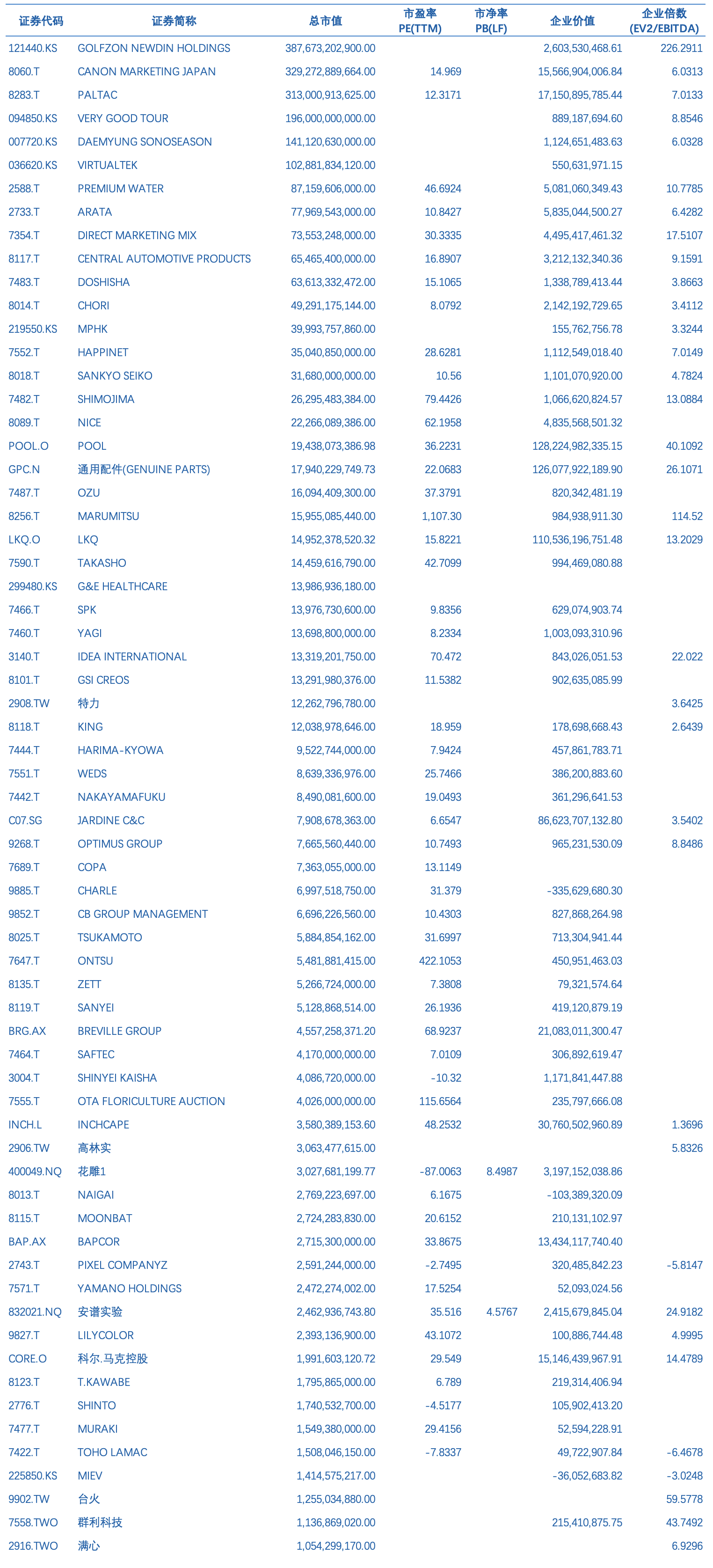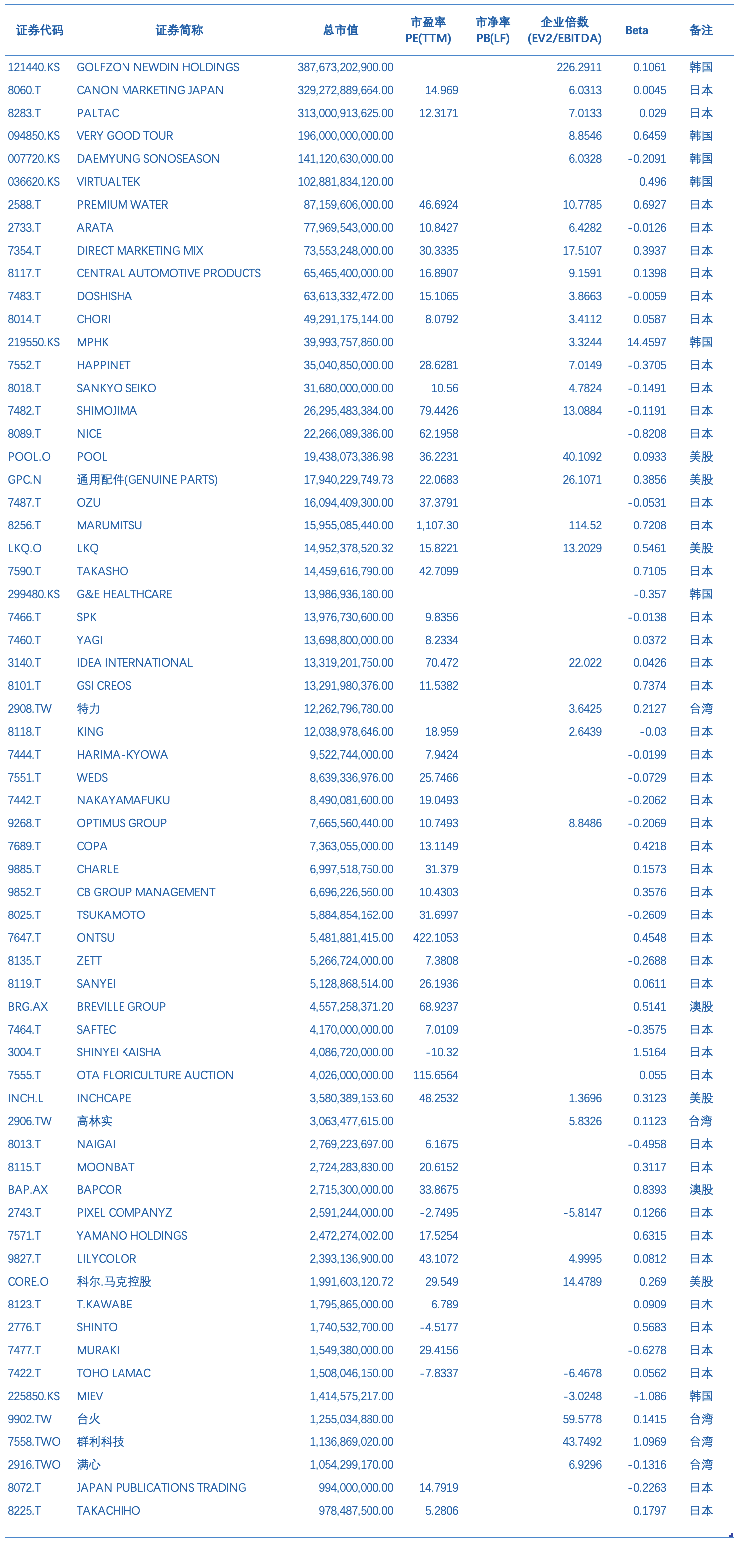 非中国消费品经销商上市企业主要有GOLFZON NEWDIN HOLDINGS[121440.KS]、CANON MARKETING JAPAN[8060.T]、PALTAC[8283.T]、VERY GOOD TOUR[094850.KS]、DAEMYUNG SONOSEASON[007720.KS]、VIRTUALTEK[2588.T]、PREMIUM WATER、ARATA[2733.T]、DIRECT MARKETING MIX[7354.T]、CENTRAL AUTOMOTIVE PRODUCTS[8117.T]、DOSHISHA[7483.T]、CHORI[8014.T]、MPHK[219550.KS]、HAPPINET[7552.T]、SANKYO SEIKO[8018.T]、SHIMOJIMA[7482.T]、NICE[8089.T]、POOL[POOL.O] 、通用配件(GENUINE PARTS) [GPC.N]、OZU[7487.T]、MARUMITSU[8256.T]、LKQ[LKQ.O]、TAKASHO[7590.T]、G&E HEALTHCARE[299480.KS]、SPK[7466.T]、YAGI[7460.T]、IDEA INTERNATIONAL[3140.T]、GSI CREOS[8101.T]、特力[2908.TW]、KING[8118.T]、HARIMA-KYOWA[7444.T]、WEDS[7551.T]、NAKAYAMAFUKU[7442.T]、OPTIMUS GROUP[9268.T]、COPA[7689.T]、CHARLE[9885.T]、CB GROUP MANAGEMENT[9852.T]、TSUKAMOTO[8025.T]、ONTSU[7647.T]等。