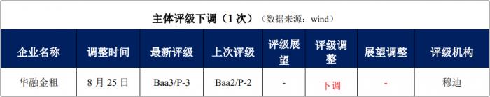 8月25日,穆迪将华融金融租赁股份有限公司的本外币长期/短期发行人评级下调至“Baa3/P-3”,仍置于下调观察名单。此外,穆迪下调了华融金租主要海外平台--华融租赁管理香港有限公司的有支持高级无抵押中期票据计划和有支持短期高级无抵押债务评级。就在8月24日,惠誉将华融金租“BBB-”长期发行人违约评级的评级观察状态由“负面观察”调整为“发展中”,并将华融租赁香港、其10亿美元中期票据计划,以及该计划下发行的无抵押票据“BBB-”评级观察状态调整为“发展中”。