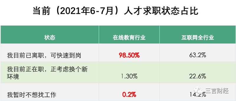 但在调查中,2021年6-7月在线教育人才求职状态中,处于“已离职,可快速到岗”的用户比例高达98.5%,而互联网全行业的此状态占比仅为63.2%。在线教育行业中,仅为0.2%对现状满意“暂时不想找工作”。