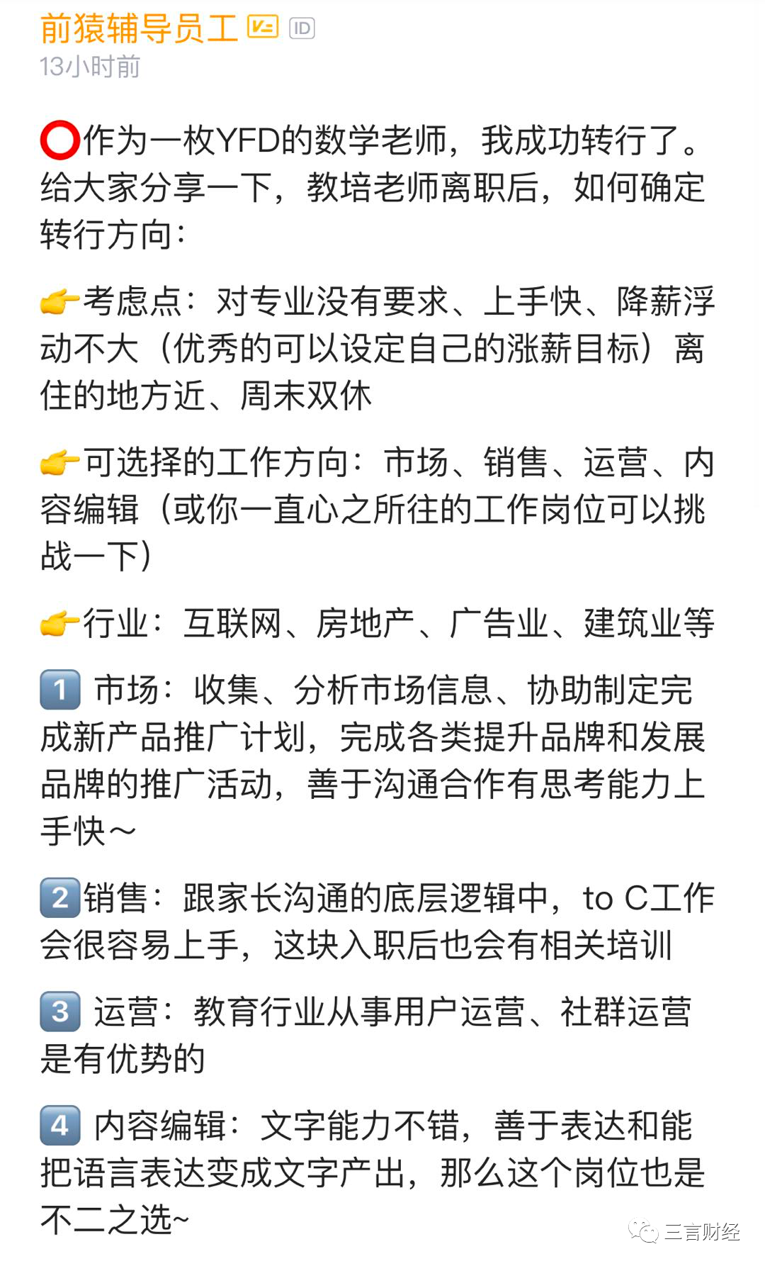 一位曾经就职于某教育机构的HR向三言财经表示,自己离开教育行业与双减有关系,但是不大,她认为主要还是看职业规划。