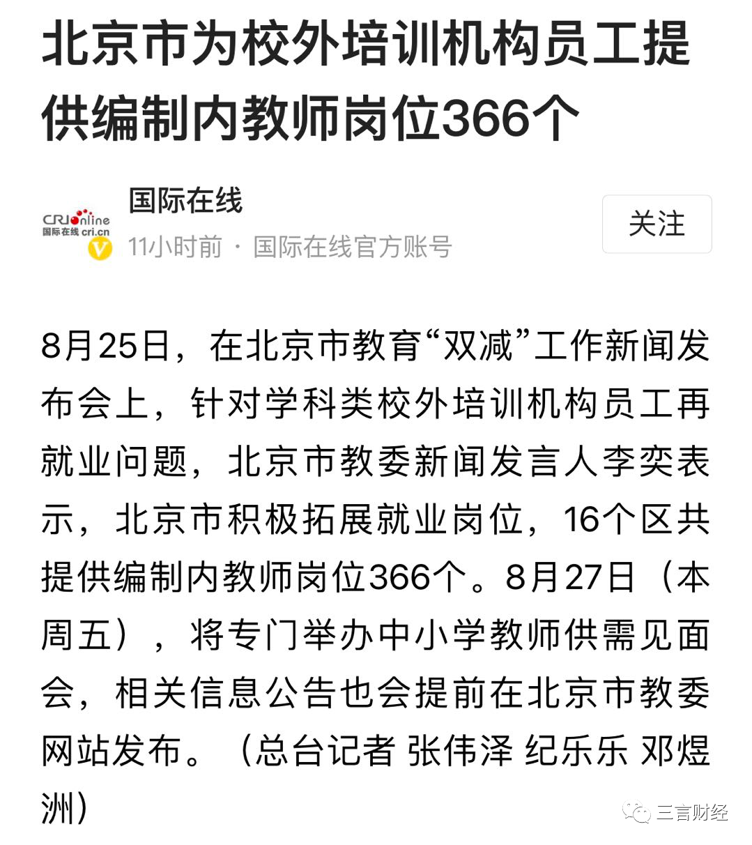 值得注意的是,针对学科类校外培训机构员工再就业问题 ,今日北京今天开放编制内教师岗位366个。但是据说北京一个大学老师各种加起来月收入才1万。